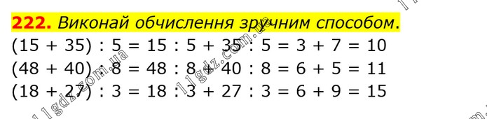 Виконай обчислення зручним способом. (15 + 35) : 5 = 15 : 5 + 35 : 5 = 3 + 7 = 10 (48 + 40) : 8 = 48 : 8 + 40 : 8 = 6 + 5 = 11 (18 + 27) : 3 = 18 : 3 + 27 : 3 = 6 + 9 = 15