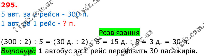 5 автобусів за 2 рейси перевезли 300 пасажирів. Скільки пасажирів перевозить один автобус за один рейс?