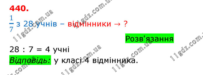 У класі 28 учнів 1/7 всіх учнів класу — відмінники. Скільки відмінників у цьому класі?