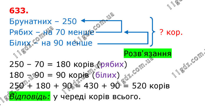 У череді 250 брунатних корів. Це на 70 корів більше, ніж рябих. Білих корів у цій череді — на 90 менше, ніж рябих. Скільки всього корів у череді?