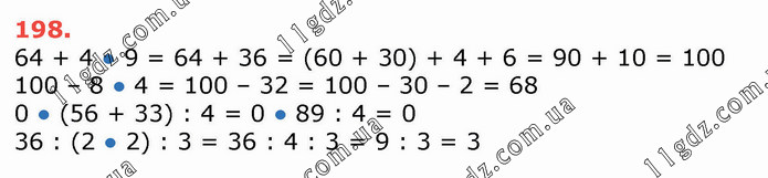64 + 4 ● 9 = 64 + 36 = (60 + 30) + 4 + 6 = 90 + 10 = 100 100 – 8 ● 4 = 100 – 32 = 100 – 30 – 2 = 68 0 ● (56 + 33) : 4 = 0 ● 89 : 4 = 0 36 : (2 ● 2) : 3 = 36 : 4 : 3 = 9 : 3 = 3