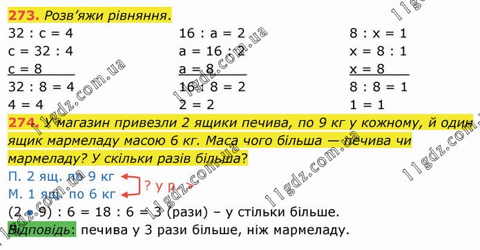 Розв’яжи рівняння. 32 : с = 4 с = 32 : 4 с = 8____ 32 : 8 = 4 4 = 4 16 : а = 2 а = 16 : 2 а = 8____ 16 : 8 = 2 2 = 2 8 : х = 1 х = 8 : 1 х = 8___ 8 : 8 = 1 1 = 1 274. У магазин привезли 2 ящики печива, по 9 кг у кожному, й один ящик мармеладу масою 6 кг. Маса чого більша — печива чи мармеладу? У скільки разів більша? П. 2 ящ. по 9 кг М. 1 ящ. по 6 кг (2 ● 9) : 6 = 18 : 6 = 3 (рази) – у стільки більше. Відповідь: печива у 3 рази більше, ніж мармеладу.