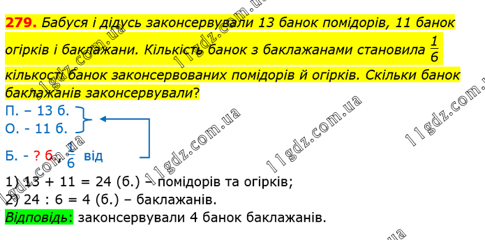 Бабуся і дідусь законсервували 13 банок помідорів, 11 банок огірків і баклажани. Кількість банок з баклажанами становила 16 кількості банок законсервованих помідорів й огірків. Скільки банок баклажанів законсервували? П. – 13 б. О. - 11 б. Б. - ? б., 16 від 1) 13 + 11 = 24 (б.) – помідорів та огірків; 2) 24 : 6 = 4 (б.) – баклажанів. Відповідь: законсервували 4 банок баклажанів.