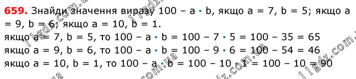 Знайди значення виразу 100 – а · b, якщо а = 7, b = 5; якщо а = 9, b = 6; якщо а = 10, b = 1. якщо а = 7, b = 5, то 100 – а · b = 100 – 7 · 5 = 100 – 35 = 65 якщо а = 9, b = 6, то 100 – а · b = 100 – 9 · 6 = 100 – 54 = 46 якщо а = 10, b = 1, то 100 – а · b = 100 – 10 · 1 = 100 – 10 = 90