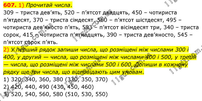 1) Прочитай числа. 309 – триста дев’ять, 520 – п’ятсот двадцять, 450 – чотириста п’ятдесят, 370 – триста сімдесят, 560 – п’ятсот шістдесят, 495 – чотириста дев’яносто п’ять, 583 – п’ятсот вісімдесят три, 340 – триста сорок, 415 – чотириста п’ятнадцять, 390 – триста дев’яносто, 545 – п’ятсот сорок п’ять. 2) У перший рядок запиши числа, що розміщені між числами 300 і 400, у другий — числа, що розміщені між числами 400 і 500, у третій — числа, що розміщені між числами 500 і 600. Допиши в кожному рядку ще три числа, що відповідають цим умовам. 1) 320, 340, 360, 380 (330, 350, 370) 2) 420, 440, 490 (430, 450, 460) 3) 520, 540, 560, 580 (510, 530, 550)