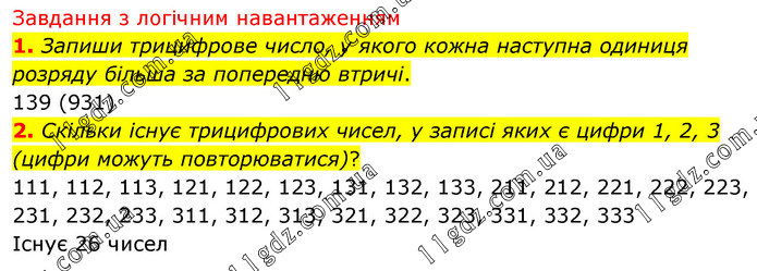 Запиши трицифрове число, у якого кожна наступна одиниця розряду більша за попередню втричі. 139 (931) 2. Скільки існує трицифрових чисел, у записі яких є цифри 1, 2, 3 (цифри можуть повторюватися)? 111, 112, 113, 121, 122, 123, 131, 132, 133, 211, 212, 221, 222, 223, 231, 232, 233, 311, 312, 313, 321, 322, 323, 331, 332, 333 Існує 26 чисел