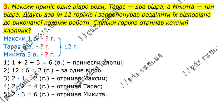 Максим приніс одне відро води, Тарас — два відра, а Микита — три відра. Дідусь дав їм 12 горіхів і запропонував розділити їх відповідно до виконаної кожним роботи. Скільки горіхів отримав кожний хлопчик? Максим 1 в. - ? г. Тарас 2 в. - ? г. 12 г. Микита 3 в. - ? г. 1) 1 + 2 + 3 = 6 (в.) – принесли хлопці; 2) 12 : 6 = 2 (г.) – за одне відро. 3) 2 · 1 = 2 (г.) – отримав Максим; 4) 2 · 2 = 4 (г.) – отримав Тарас; 5) 2 · 3 = 6 (г.) – отримав Микита.