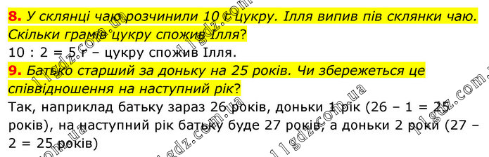 У склянці чаю розчинили 10 г цукру. Ілля випив пів склянки чаю. Скільки грамів цукру спожив Ілля? 10 : 2 = 5 г – цукру спожив Ілля. 9. Батько старший за доньку на 25 років. Чи збережеться це співвідношення на наступний рік? Так, наприклад батьку зараз 26 років, доньки 1 рік (26 – 1 = 25 років), на наступний рік батьку буде 27 років, а доньки 2 роки (27 – 2 = 25 років)