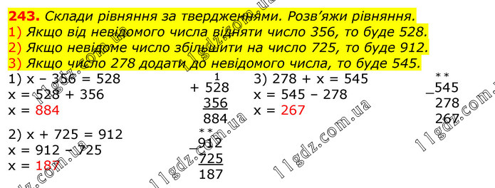 Склади рівняння за твердженнями. Розв’яжи рівняння. 1) Якщо від невідомого числа відняти число 356, то буде 528. 2) Якщо невідоме число збільшити на число 725, то буде 912. 3) Якщо число 278 додати до невідомого числа, то буде 545.
