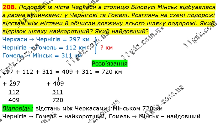 Подорож із міста Черкаси в столицю Білорусі Мінськ відбувалася з двома зупинками: у Чернігові та Гомелі. Розглянь на схемі подорожі відстані між містами й обчисли довжину всього шляху подорожі. Який відрізок шляху найкоротший? Який найдовший? Черкаси → Чернігів = 297 км Чернігів → Гомель = 112 км ? км Гомель → Мінськ = 311 км Розв’язання 297 + 112 + 311 = 409 + 311 = 720 км Відповідь: відстань між Черкасами і Мінськом 720 км Чернігів → Гомель – найкоротший, Гомель → Мінськ – найдовший