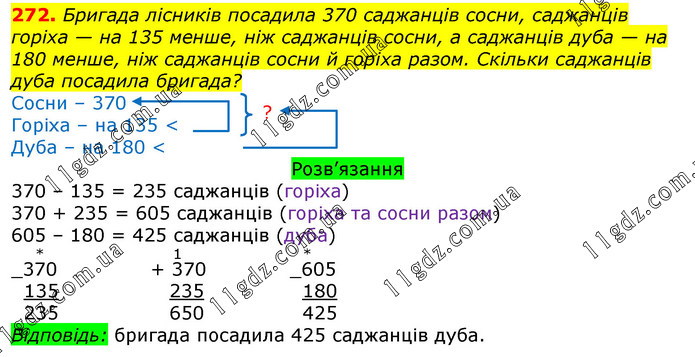 Бригада лісників посадила 370 саджанців сосни, саджанців горіха — на 135 менше, ніж саджанців сосни, а саджанців дуба — на 180 менше, ніж саджанців сосни й горіха разом. Скільки саджанців дуба посадила бригада?