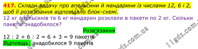 Склади задачу про апельсини й мандарини із числами 12, 6 і 2, щоб її розв’язання відповідало блок-схемі. 12 кг апельсинів та 6 кг мандарин розклали в пакети по 2 кг. Скільки пакетів знадобилося?
