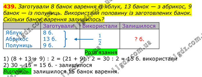Заготували 8 банок варення із яблук, 13 банок — з абрикос, 9 банок — із полуниць. Використали половину із заготовлених банок. Скільки банок варення залишилось?