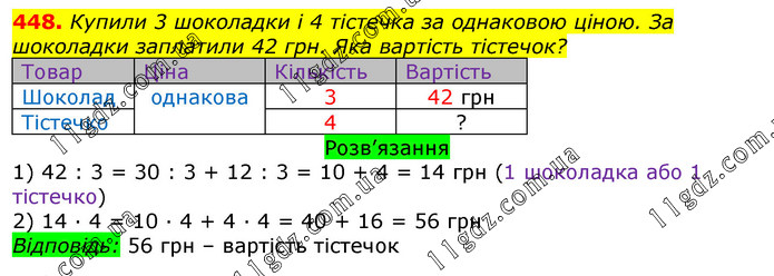 . Купили 3 шоколадки і 4 тістечка за однаковою ціною. За шоколадки заплатили 42 грн. Яка вартість тістечок?