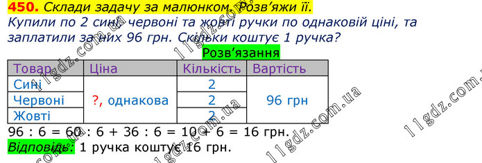 Склади задачу за малюнком. Розв’яжи її. Купили по 2 сині, червоні та жовті ручки по однаковій ціні, та заплатили за них 96 грн. Скільки коштує 1 ручка?