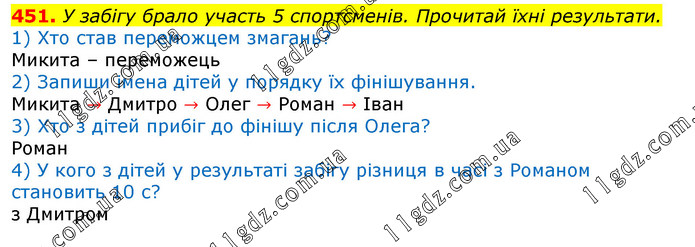 У забігу брало участь 5 спортсменів. Прочитай їхні результати. 1) Хто став переможцем змагань? 2) Запиши імена дітей у порядку їх фінішування.