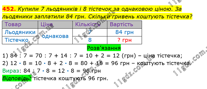 Купили 7 льодяників і 8 тістечок за однаковою ціною. За льодяники заплатили 84 грн. Скільки гривень коштують тістечка? 1) 84 : 7 = 70 : 7 + 14 : 7 = 10 + 2 = 12 (грн) – ціна тістечка; 2) 12 ∙ 8 = 10 ∙ 8 + 2 ∙ 8 = 80 + 16 = 96 грн – коштують тістечка. Вираз: 84 : 7 ∙ 8 = 12 ∙ 8 = 96 грн Відповідь: тістечка коштують 96 грн.