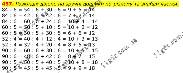 Розклади ділене на зручні доданки по-різному та знайди частки. 84 : 6