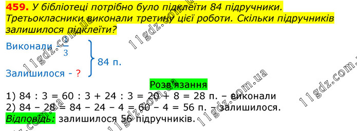 У бібліотеці потрібно було підклеїти 84 підручники. Третьокласники виконали третину цієї роботи. Скільки підручників залишилося підклеїти?