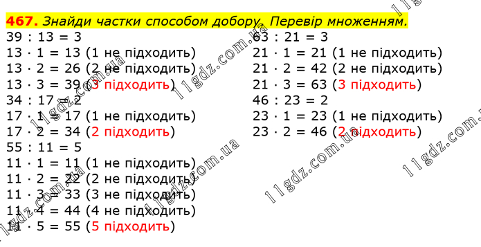 Знайди частки способом добору. Перевір множенням. 39 : 13 = 3 63 : 21 = 3 13 ∙ 1 = 13 (1 не підходить) 13 ∙ 2 = 26 (2 не підходить) 13 ∙ 3 = 39 (3 підходить) 21 ∙ 1 = 21 (1 не підходить) 21 ∙ 2 = 42 (2 не підходить) 21 ∙ 3 = 63 (3 підходить) 34 : 17 = 2 46 : 23 = 2 17 ∙ 1 = 17 (1 не підходить) 17 ∙ 2 = 34 (2 підходить) 23 ∙ 1 = 23 (1 не підходить) 23 ∙ 2 = 46 (2 підходить) 55 : 11 = 5 11 ∙ 1 = 11 (1 не підходить) 11 ∙ 2 = 22 (2 не підходить) 11 ∙ 3 = 33 (3 не підходить) 11 ∙ 4 = 44 (4 не підходить) 11 ∙ 5 = 55 (5 підходить)