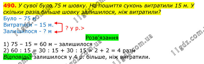 У сувої було 75 м шовку. На пошиття суконь витратили 15 м. У скільки разів більше шовку залишилося, ніж витратили?