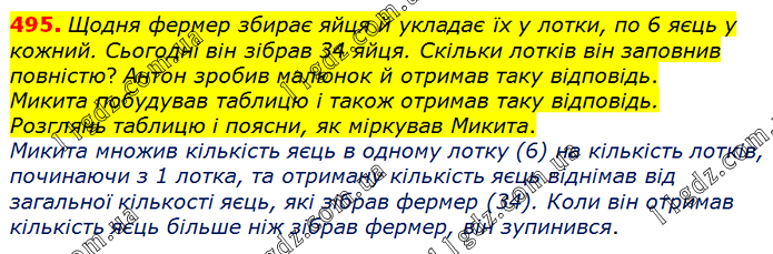 Щодня фермер збирає яйця й укладає їх у лотки, по 6 яєць у кожний. Сьогодні він зібрав 34 яйця. Скільки лотків він заповнив повністю? Антон зробив малюнок й отримав таку відповідь. Микита побудував таблицю і також отримав таку відповідь. Розглянь таблицю і поясни, як міркував Микита.