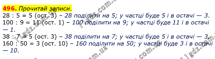 Прочитай записи. 28 : 5 = 5 (ост. 3) – 28 поділити на 5; у частці буде 5 і в остачі — 3. 100 : 9 = 11 (ост. 1) – 100 поділити на 9; у частці буде 11 і в остачі — 1. 38 : 7 = 5 (ост. 3) – 38 поділити на 7; у частці буде 5 і в остачі — 3. 160 : 50 = 3 (ост. 10) – 160 поділити на 50; у частці буде 3 і в остачі — 10.