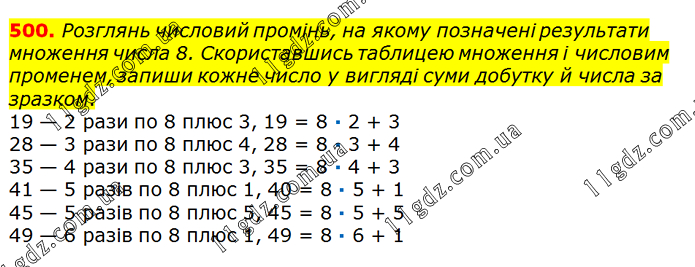 Розглянь числовий промінь, на якому позначені результати множення числа 8. Скориставшись таблицею множення і числовим променем, запиши кожне число у вигляді суми добутку й числа за зразком.