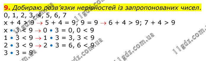 Добираю розв’язки нерівностей із запропонованих чисел. 0, 1, 2, 3, 4, 5, 6, 7 х + 4 > 9 -> 5 + 4 = 9; 9 = 9 -> 6 + 4 > 9; 7 + 4 > 9 х • 3 < 9 -> 0 • 3 = 0, 0 < 9 1 • 3 < 9 -> 1 • 3 = 3, 3 < 9 2 • 3 < 9 -> 2 • 3 = 6, 6 < 9 3 • 3 = 9