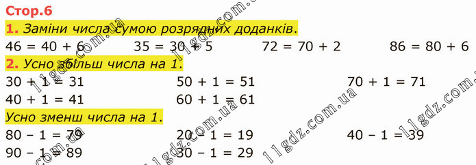Заміни числа сумою розрядних доданків. 46 = 40 + 6 35 = 30 + 5 72 = 70 + 2 86 = 80 + 6 2. Усно збільш числа на 1. 30 + 1 = 31 40 + 1 = 41 50 + 1 = 51 60 + 1 = 61 70 + 1 = 71 Усно зменш числа на 1. 80 – 1 = 79 90 – 1 = 89 20 – 1 = 19 30 – 1 = 29