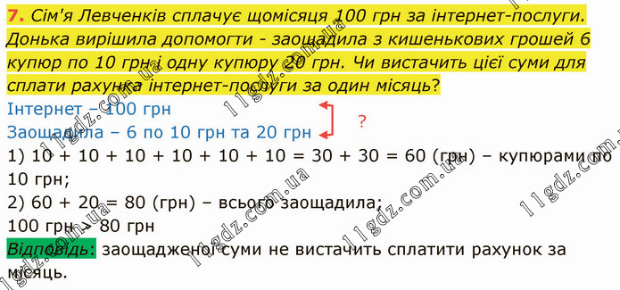 Сім'я Левченків сплачує щомісяця 100 грн за інтернет-послуги. Донька вирішила допомогти - заощадила з кишенькових грошей 6 купюр по 10 грн і одну купюру 20 грн. Чи вистачить цієї суми для сплати рахунка інтернет-послуги за один місяць? Інтернет – 100 грн Заощадила – 6 по 10 грн та 20 грн 1) 10 + 10 + 10 + 10 + 10 + 10 = 30 + 30 = 60 (грн) – купюрами по 10 грн; 2) 60 + 20 = 80 (грн) – всього заощадила; 100 грн > 80 грн Відповідь: заощадженої суми не вистачить сплатити рахунок за місяць.