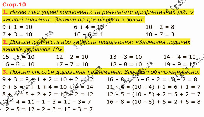 Назви пропущені компоненти та результати арифметичних дій, їх числові значення. Запиши по три рівності в зошит. 9 + 1 = 10 7 + 3 = 10 6 + 4 = 10 10 – 6 = 4 10 – 2 = 8 10 – 7 = 3 2. Доведи істинність або хибність твердження: «Значення поданих виразів дорівнює 10». 15 – 5 = 10 16 – 6 = 10 12 – 2 = 10 17 – 7 = 10 13 – 3 = 10 18 – 8 = 10 14 – 4 = 10 19 – 9 = 10 3. Поясни способи додавання і віднімання. Заверши обчислення усно. 9 + 3 = 9 + 1 + 2 = 10 + 2 = 12 9 + 5 = 9 + 1 + 4 = 10 + 4 = 14 8 + 4 = 8 + 2 + 2 = 10 + 2 = 12 11 – 4 = 11 – 1 – 3 = 10 – 3= 7 12 – 5 = 12 – 2 – 3 = 10 – 3 = 7 16 – 8 = 16 – 6 – 2 = 10 – 2 = 8 11 – 4 = (10 – 4) + 1 = 6 + 1 = 7 12 – 5 = (10 – 5) + 2 = 5 + 2 = 7 16 – 8 = (10 – 8) + 6 = 2 + 6 = 8