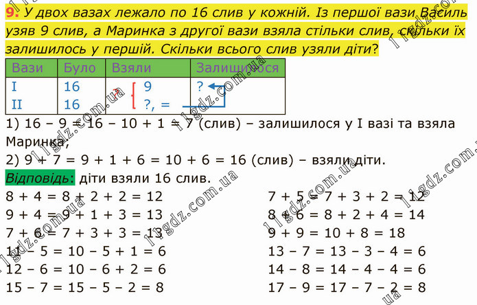 У двох вазах лежало по 16 слив у кожній. Із першої вази Василь узяв 9 слив, а Маринка з другої вази взяла стільки слив, скільки їх залишилось у першій. Скільки всього слив узяли діти? 1) 16 – 9 = 16 – 10 + 1 = 7 (слив) – залишилося у І вазі та взяла Маринка; 2) 9 + 7 = 9 + 1 + 6 = 10 + 6 = 16 (слив) – взяли діти. Відповідь: діти взяли 16 слив. 8 + 4 = 8 + 2 + 2 = 12 9 + 4 = 9 + 1 + 3 = 13 7 + 6 = 7 + 3 + 3 = 13 11 – 5 = 10 – 5 + 1 = 6 12 – 6 = 10 – 6 + 2 = 6 15 – 7 = 15 – 5 – 2 = 8 7 + 5 = 7 + 3 + 2 = 12 8 + 6 = 8 + 2 + 4 = 14 9 + 9 = 10 + 8 = 18 13 – 7 = 13 – 3 – 4 = 6 14 – 8 = 14 – 4 – 4 = 6 17 – 9 = 17 – 7 – 2 = 8