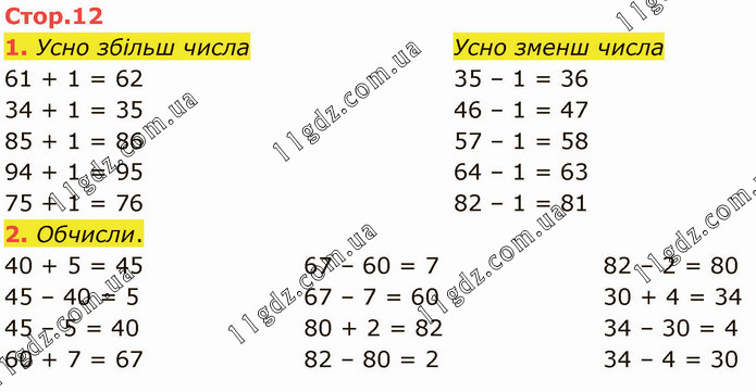 Усно збільш числа 61 + 1 = 62 34 + 1 = 35 85 + 1 = 86 94 + 1 = 95 75 + 1 = 76 Усно зменш числа 35 – 1 = 36 46 – 1 = 47 57 – 1 = 58 64 – 1 = 63 82 – 1 = 81 2. Обчисли. 40 + 5 = 45 45 – 40 = 5 45 – 5 = 40 60 + 7 = 67 67 – 60 = 7 67 – 7 = 60 80 + 2 = 82 82 – 80 = 2 82 – 2 = 80 30 + 4 = 34 34 – 30 = 4 34 – 4 = 30
