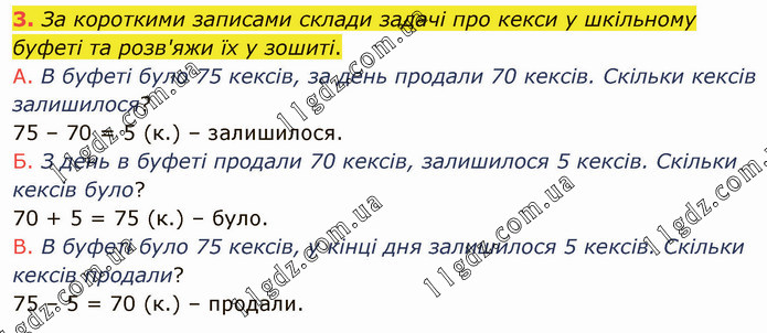 За короткими записами склади задачі про кекси у шкільному буфеті та розв'яжи їх у зошиті. А. В буфеті було 75 кексів, за день продали 70 кексів. Скільки кексів залишилося? 75 – 70 = 5 (к.) – залишилося. Б. З день в буфеті продали 70 кексів, залишилося 5 кексів. Скільки кексів було? 70 + 5 = 75 (к.) – було. В. В буфеті було 75 кексів, у кінці дня залишилося 5 кексів. Скільки кексів продали? 75 – 5 = 70 (к.) – продали.
