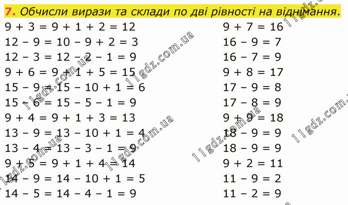 Обчисли вирази та склади по дві рівності на віднімання. 9 + 3 = 9 + 1 + 2 = 12 12 – 9 = 10 – 9 + 2 = 3 12 – 3 = 12 – 2 – 1 = 9 9 + 6 = 9 + 1 + 5 = 15 15 – 9 = 15 – 10 + 1 = 6 15 – 6 = 15 – 5 – 1 = 9 9 + 4 = 9 + 1 + 3 = 13 13 – 9 = 13 – 10 + 1 = 4 13 – 4 = 13 – 3 – 1 = 9 9 + 5 = 9 + 1 + 4 = 14 14 – 9 = 14 – 10 + 1 = 5 14 – 5 = 14 – 4 – 1 = 9 9 + 7 = 16 16 – 9 = 7 16 – 7 = 9 9 + 8 = 17 17 – 9 = 8 17 – 8 = 9 9 + 9 = 18 18 – 9 = 9 18 – 9 = 9 9 + 2 = 11 11 – 9 = 2 11 – 2 = 9