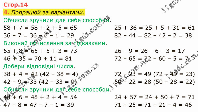 Попрацюй за варіантами. Обчисли зручним для себе способом. 58 + 7 = 58 + 2 + 5 = 65 36 – 7 = 36 – 6 – 1 = 29 25 + 36 = 25 + 5 + 31 = 61 82 – 44 = 82 – 42 – 2 = 38 Виконай обчислення за підказками. 65 + 8 = 65 + 5 + 3 = 73 46 + 35 = 70 + 11 = 81 26 – 9 = 26 – 6 – 3 = 17 72 – 65 = 72 – 60 – 5 = 7 Добери відповідні числа. 38 + 4 = 42 (42 – 38 = 4) 42 – 9 = 33 (42 – 33 = 9) 72 – 23 = 49 (72 – 49 = 23) 50 – 22 = 28 (50 – 28 = 22) Обчисли зручним для себе способом. 48 + 6 = 48 + 2 + 4 = 54 47 – 8 = 47 – 7 – 1 = 39 24 + 57 = 24 + 50 + 7 = 71 71 – 25 = 71 – 21 – 4 = 46