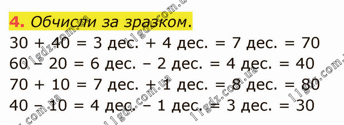 Обчисли за зразком. 30 + 40 = 3 дес. + 4 дес. = 7 дес. = 70 60 – 20 = 6 дес. – 2 дес. = 4 дес. = 40 70 + 10 = 7 дес. + 1 дес. = 8 дес. = 80 40 – 10 = 4 дес. – 1 дес. = 3 дес. = 30