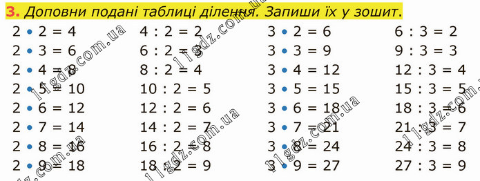 Доповни подані таблиці ділення. Запиши їх у зошит. 2 • 2 = 4 2 • 3 = 6 2 • 4 = 8 2 • 5 = 10 2 • 6 = 12 2 • 7 = 14 2 • 8 = 16 2 • 9 = 18 4 : 2 = 2 6 : 2 = 3 8 : 2 = 4 10 : 2 = 5 12 : 2 = 6 14 : 2 = 7 16 : 2 = 8 18 : 2 = 9 3 • 2 = 6 3 • 3 = 9 3 • 4 = 12 3 • 5 = 15 3 • 6 = 18 3 • 7 = 21 3 • 8 = 24 3 • 9 = 27 6 : 3 = 2 9 : 3 = 3 12 : 3 = 4 15 : 3 = 5 18 : 3 = 6 21 : 3 = 7 24 : 3 = 8 27 : 3 = 9