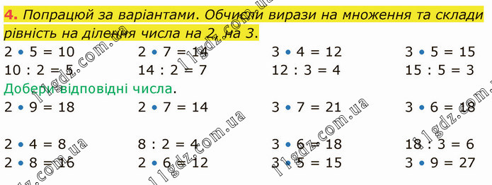 Попрацюй за варіантами. Обчисли вирази на множення та склади рівність на ділення числа на 2, на 3. 2 • 5 = 10 10 : 2 = 5 2 • 7 = 14 14 : 2 = 7 3 • 4 = 12 12 : 3 = 4 3 • 5 = 15 15 : 5 = 3 Добери відповідні числа. 2 • 9 = 18 2 • 7 = 14 3 • 7 = 21 3 • 6 = 18 2 • 4 = 8 8 : 2 = 4 3 • 6 = 18 18 : 3 = 6 2 • 8 = 16 2 • 6 = 12 3 • 5 = 15 3 • 9 = 27
