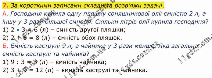 За короткими записами склади та розв’яжи задачі. А. Господиня купила одну пляшку соняшникової олії ємністю 2 л, а іншу у 3 рази більшої ємності. Скільки літрів олії купила господиня? 1) 2 • 3 = 6 (л) – ємність другої пляшки; 2) 2 + 6 = 8 (л) – ємність обох пляшок. Б. Ємність каструлі 9 л, а чайника у 3 рази менше. Яка загальна ємність каструлі та чайника? 1) 9 : 3 = 3 (л) – ємність чайника; 2) 3 + 9 = 12 (л) – ємність каструлі та чайника.