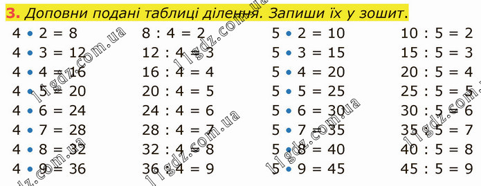 Доповни подані таблиці ділення. Запиши їх у зошит. 4 • 2 = 8 4 • 3 = 12 4 • 4 = 16 4 • 5 = 20 4 • 6 = 24 4 • 7 = 28 4 • 8 = 32 4 • 9 = 36 8 : 4 = 2 12 : 4 = 3 16 : 4 = 4 20 : 4 = 5 24 : 4 = 6 28 : 4 = 7 32 : 4 = 8 36 : 4 = 9 5 • 2 = 10 5 • 3 = 15 5 • 4 = 20 5 • 5 = 25 5 • 6 = 30 5 • 7 = 35 5 • 8 = 40 5 • 9 = 45 10 : 5 = 2 15 : 5 = 3 20 : 5 = 4 25 : 5 = 5 30 : 5 = 6 35 : 5 = 7 40 : 5 = 8 45 : 5 = 9