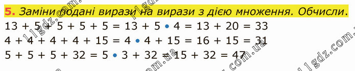 Заміни подані вирази на вирази з дією множення. Обчисли. 13 + 5 + 5 + 5 + 5 = 13 + 5 • 4 = 13 + 20 = 33 4 + 4 + 4 + 4 + 15 = 4 • 4 + 15 = 16 + 15 = 31 5 + 5 + 5 + 32 = 5 • 3 + 32 = 15 + 32 = 47