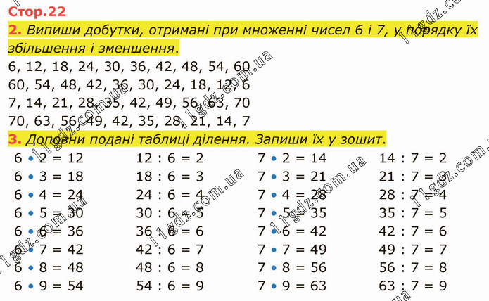 Випиши добутки, отримані при множенні чисел 6 і 7, у порядку їх збільшення і зменшення. 6, 12, 18, 24, 30, 36, 42, 48, 54, 60 60, 54, 48, 42, 36, 30, 24, 18, 12, 6 7, 14, 21, 28, 35, 42, 49, 56, 63, 70 70, 63, 56, 49, 42, 35, 28, 21, 14, 7 3. Доповни подані таблиці ділення. Запиши їх у зошит. 6 • 2 = 12 6 • 3 = 18 6 • 4 = 24 6 • 5 = 30 6 • 6 = 36 6 • 7 = 42 6 • 8 = 48 6 • 9 = 54 12 : 6 = 2 18 : 6 = 3 24 : 6 = 4 30 : 6 = 5 36 : 6 = 6 42 : 6 = 7 48 : 6 = 8 54 : 6 = 9 7 • 2 = 14 7 • 3 = 21 7 • 4 = 28 7 • 5 = 35 7 • 6 = 42 7 • 7 = 49 7 • 8 = 56 7 • 9 = 63 14 : 7 = 2 21 : 7 = 3 28 : 7 = 4 35 : 7 = 5 42 : 7 = 6 49 : 7 = 7 56 : 7 = 8 63 : 7 = 9