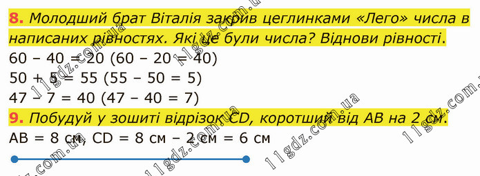 Молодший брат Віталія закрив цеглинками «Лего» числа в написаних рівностях. Які це були числа? Віднови рівності. 60 – 40 = 20 (60 – 20 = 40) 50 + 5 = 55 (55 – 50 = 5) 47 – 7 = 40 (47 – 40 = 7) 9. Побудуй у зошиті відрізок CD, коротший від АВ на 2 см. АВ = 8 см, СD = 8 см – 2 см = 6 см