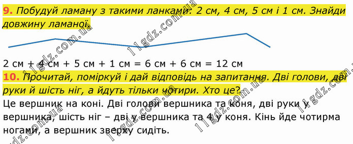 Побудуй ламану з такими ланками: 2 см, 4 см, 5 см і 1 см. Знайди довжину ламаної. 2 см + 4 см + 5 см + 1 см = 6 см + 6 см = 12 см 10. Прочитай, поміркуй і дай відповідь на запитання. Дві голови, дві руки й шість ніг, а йдуть тільки чотири. Хто це? Це вершник на коні. Дві голови вершника та коня, дві руки у вершника, шість ніг – дві у вершника та 4 у коня. Кінь йде чотирма ногами, а вершник зверху сидіть.