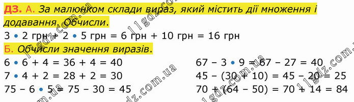 А. За малюнком склади вираз, який містить дії множення і додавання. Обчисли. 3 • 2 грн + 2 • 5 грн = 6 грн + 10 грн = 16 грн Б. Обчисли значення виразів. 6 • 6 + 4 = 36 + 4 = 40 7 • 4 + 2 = 28 + 2 = 30 75 – 6 • 5 = 75 – 30 = 45 67 – 3 • 9 = 67 – 27 = 40 45 – (30 + 10) = 45 – 20 = 25 70 + (64 – 50) = 70 + 14 = 84