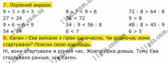 Порівняй вирази. 9 • 3 > 8 • 3 27 > 24 9 • 6 = 6 • 9 54 = 54 8 • 7 < 9 • 8 56 < 72 54 : 9 < 56 : 8 6 < 7 72 : 8 > 64 : 8 9 > 8 48 : 8 > 45 : 9 6 > 5 8. Євген і Єва виїхали з гірок одночасно, Чи водночас вони стартували? Поясни свою відповідь. Ні, вони стартували в різний час. Жовта гірка довша. Тому Єва стартувала раніше, ніж Євген.