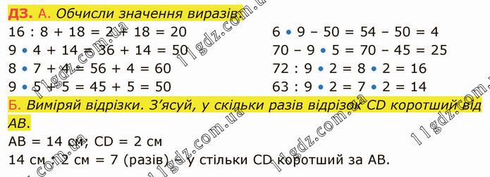 А. Обчисли значення виразів. 16 : 8 + 18 = 2 + 18 = 20 9 • 4 + 14 = 36 + 14 = 50 8 • 7 + 4 = 56 + 4 = 60 9 • 5 + 5 = 45 + 5 = 50 6 • 9 – 50 = 54 – 50 = 4 70 – 9 • 5 = 70 – 45 = 25 72 : 9 • 2 = 8 • 2 = 16 63 : 9 • 2 = 7 • 2 = 14 Б. Виміряй відрізки. З’ясуй, у скільки разів відрізок СD коротший від АВ. АВ = 14 см; CD = 2 см 14 см : 2 см = 7 (разів) – у стільки CD коротший за АВ.