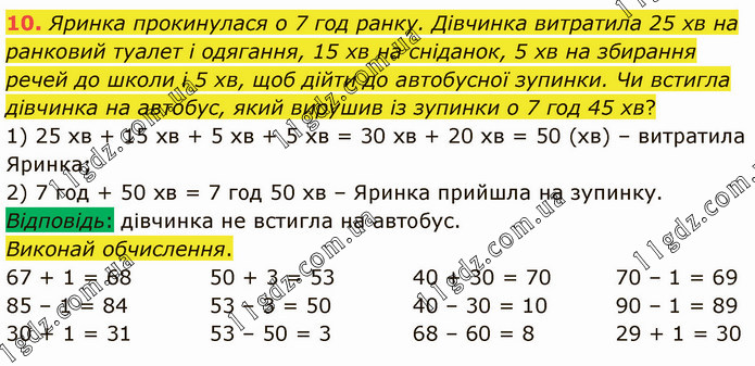 Яринка прокинулася о 7 год ранку. Дівчинка витратила 25 хв на ранковий туалет і одягання, 15 хв на сніданок, 5 хв на збирання речей до школи і 5 хв, щоб дійти до автобусної зупинки. Чи встигла дівчинка на автобус, який вирушив із зупинки о 7 год 45 хв? 1) 25 хв + 15 хв + 5 хв + 5 хв = 30 хв + 20 хв = 50 (хв) – витратила Яринка; 2) 7 год + 50 хв = 7 год 50 хв – Яринка прийшла на зупинку. Відповідь: дівчинка не встигла на автобус. Виконай обчислення. 67 + 1 = 68 85 – 1 = 84 30 + 1 = 31 50 + 3 = 53 53 – 3 = 50 53 – 50 = 3 40 + 30 = 70 40 – 30 = 10 68 – 60 = 8 70 – 1 = 69 90 – 1 = 89 29 + 1 = 30